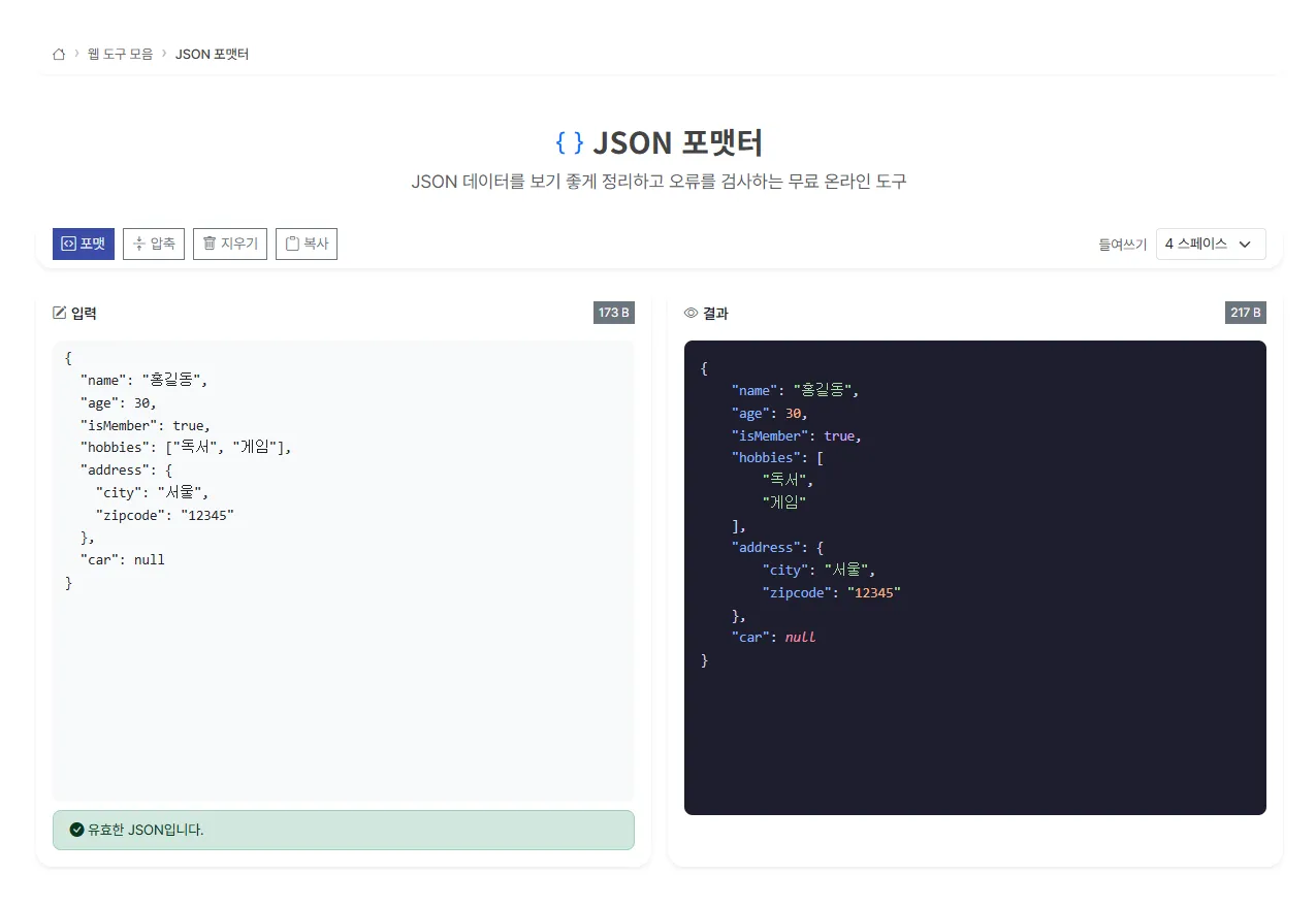 포맷 (Beautify)압축된 JSON에 들여쓰기와 줄바꿈을 적용하여 읽기 쉽게 정리합니다.