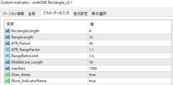 ATRの期間や倍数、小さいローソク足が何本続けばレクタングルで囲むか等について詳しく設定できます。