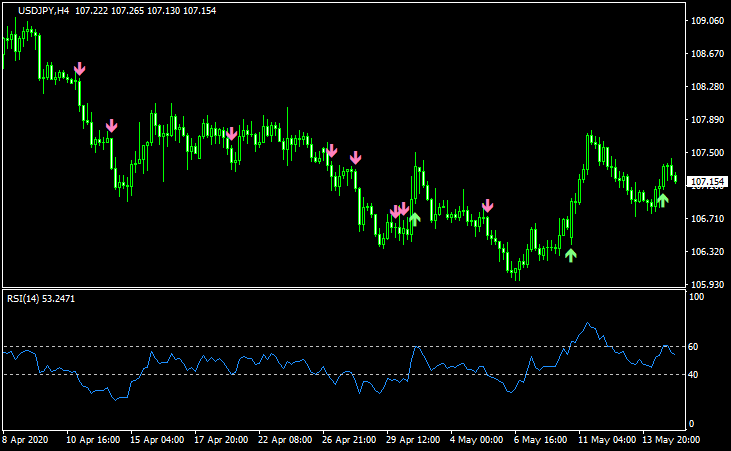 RSIが60以上で上矢印、40以下で下矢印が出ているのがわかると思います。
