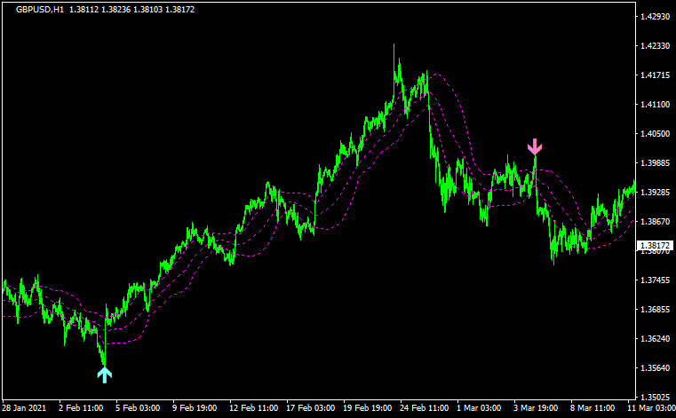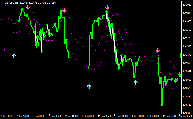 例えば下のチャートではRISKを4、ボリバンの期間を50、2σを跨いだらサインが出るようにしています。